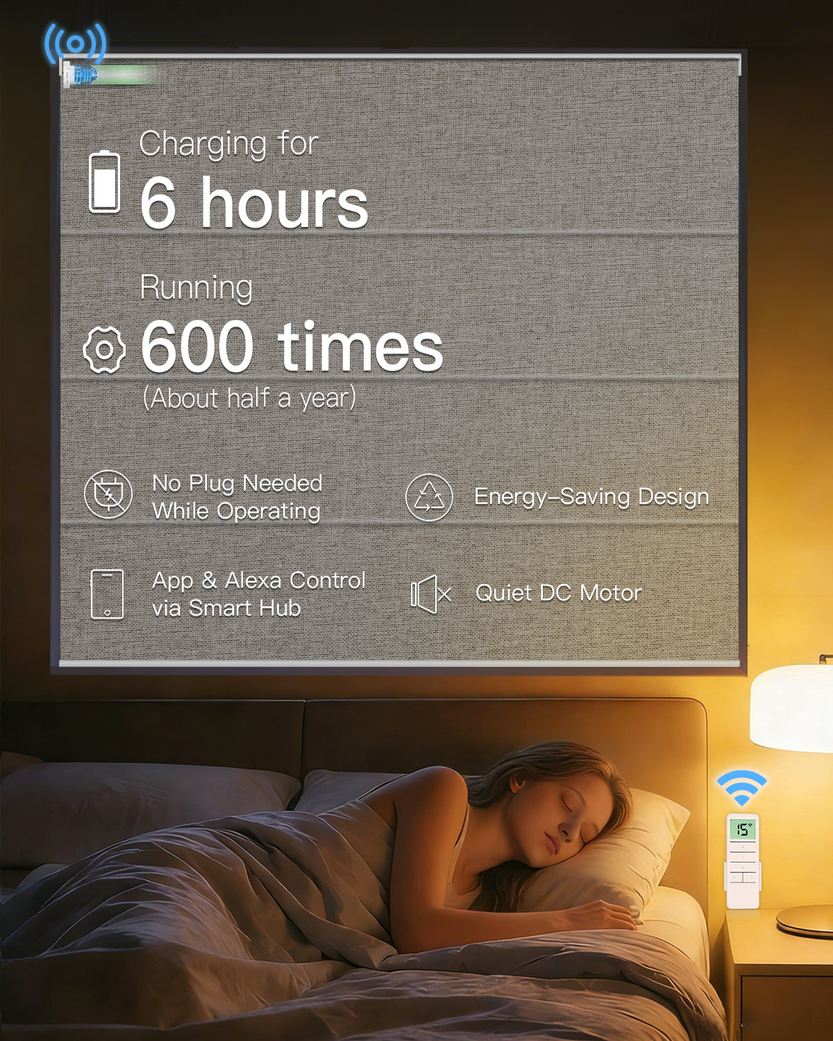 - Smart Motorized Control – Electric Roman shades with remote feature a rechargeable motor lasting 3–6 months per charge. Optional solar panel available. Works with Alexa and Google Home smart shades via RF hub (required). Multiple remote control options available.