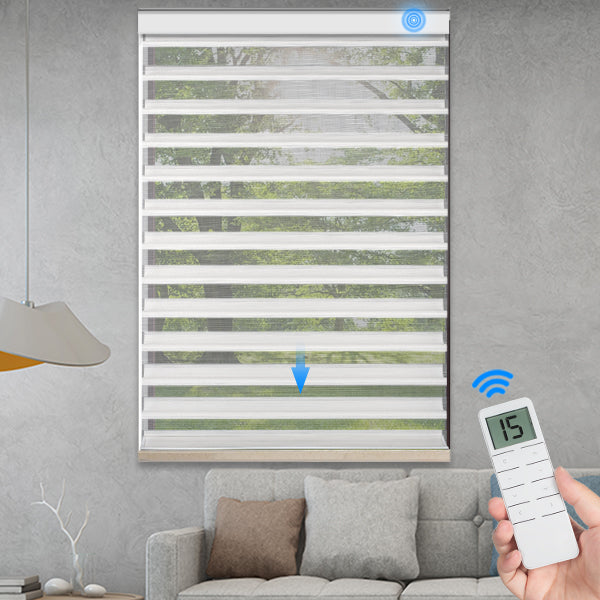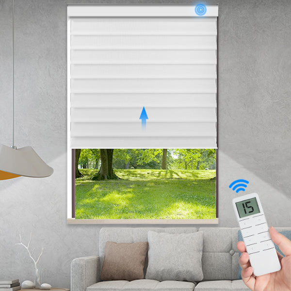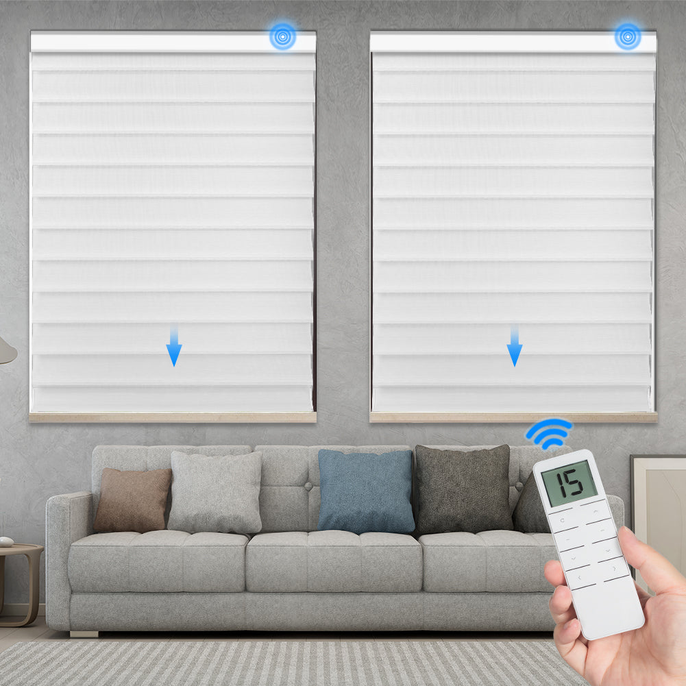 Tokblind motorized Shangri-La sheer shades let you control light with ease. Raise or lower the shade with a simple click on the remote. For voice, app, or timer control, connect to Alexa or Google Assistant via an RF hub.