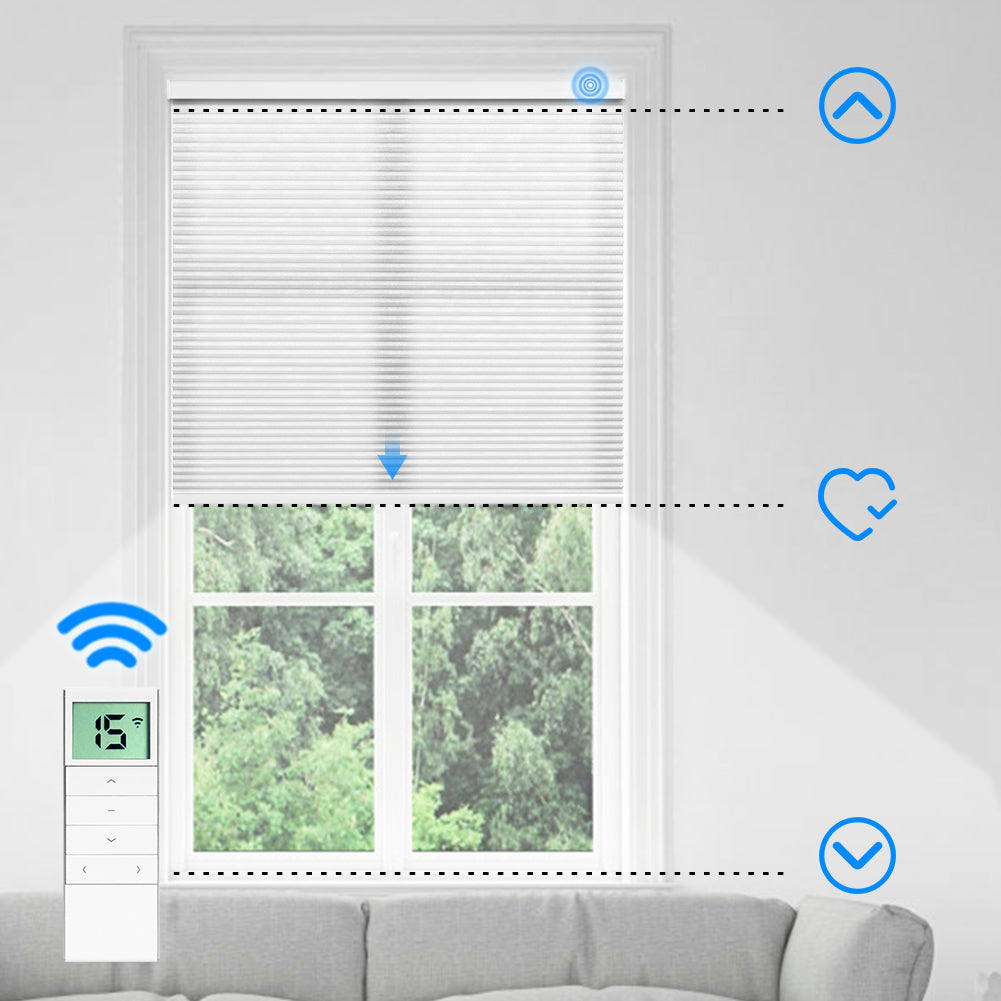 Made with 50%-80% blackout fabric, these motorized cellular shades filter natural light while maintaining privacy. The unique honeycomb-shaped fabric cells expand and contract as the shade is raised or lowered, providing energy efficiency, noise reduction, and UV protection. The cordless design ensures a safe environment for children and pets. Perfect for living rooms, bedrooms, kids' rooms, home offices, media rooms, and offices. For indoor use only.