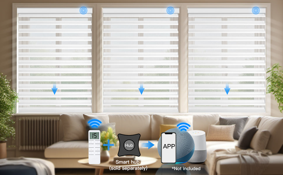 Pre-programmed motor works with the remote right after installation. To connect with Alexa or Google, an RF hub is needed. Add a solar panel if charging is hard —1 panel powers 1 blind.