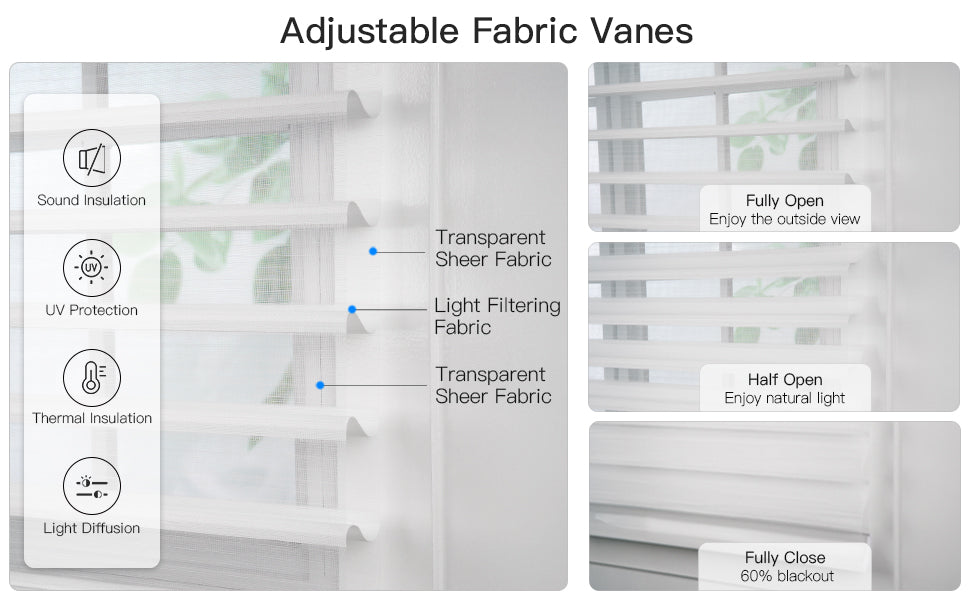 Shangri-La shade features soft fabric vanes and sheer panels. It filters light gently, blocks glare, protects from UV, and offers adjustable privacy. Vane angle can be adjusted only when fully lowered.